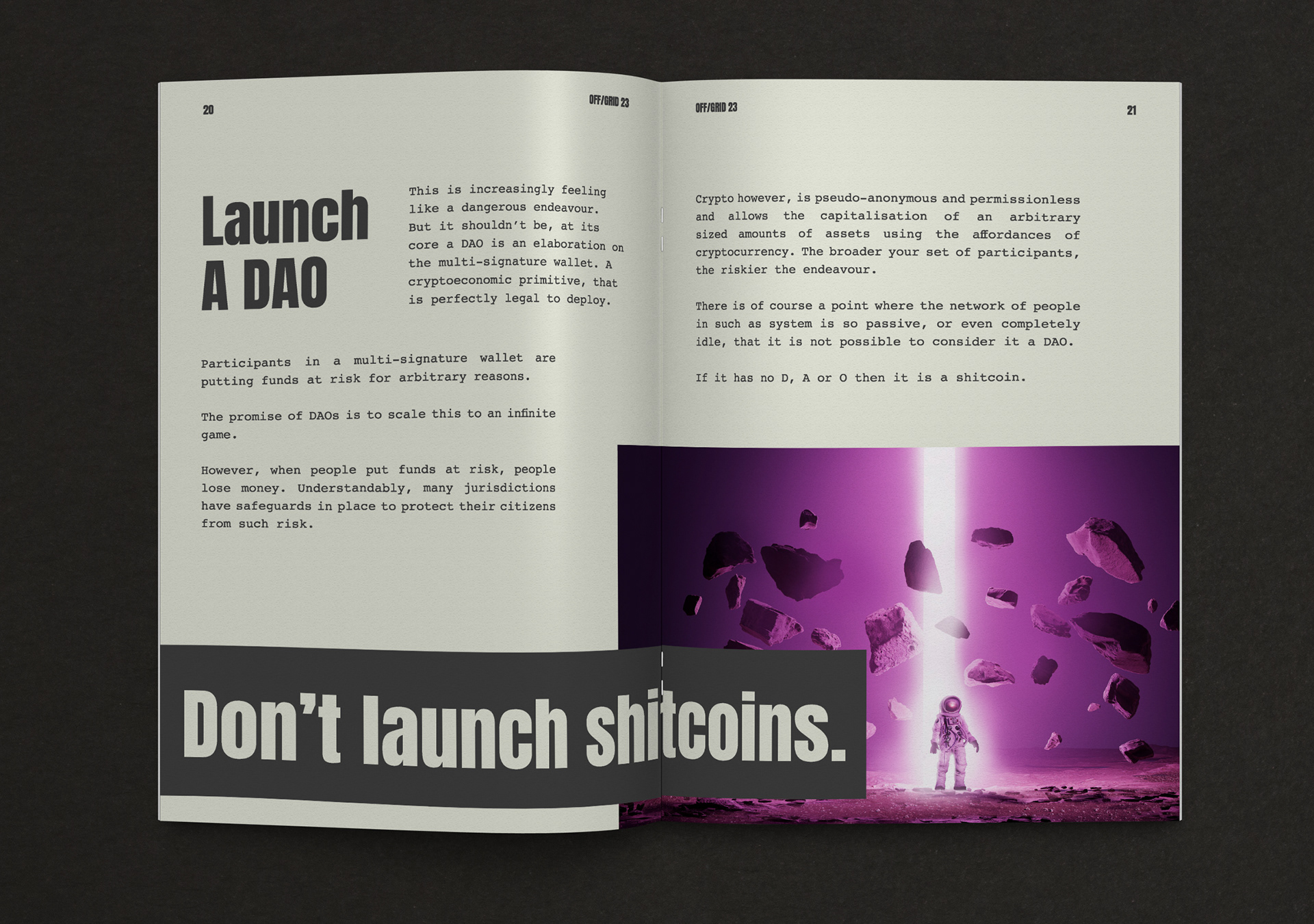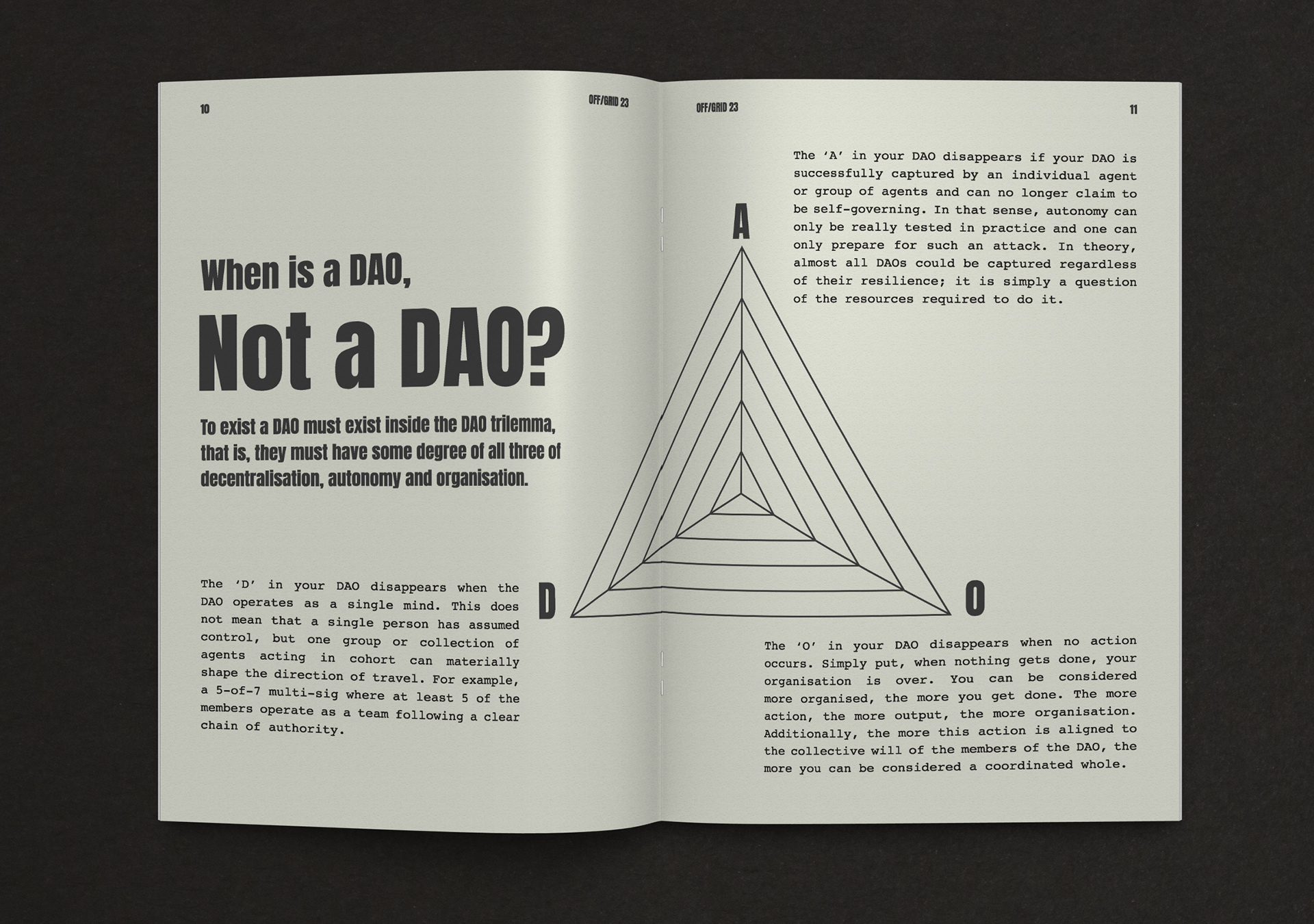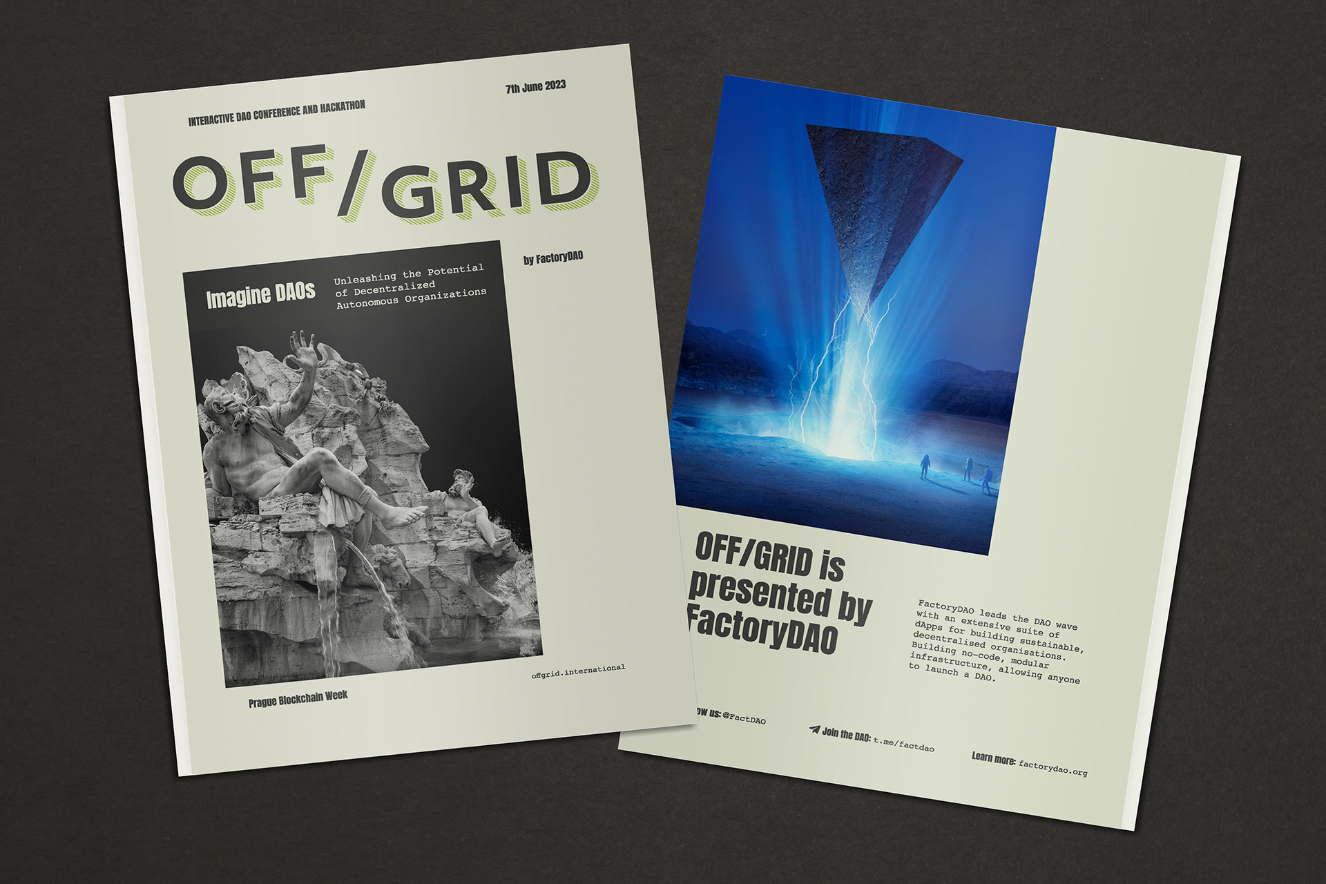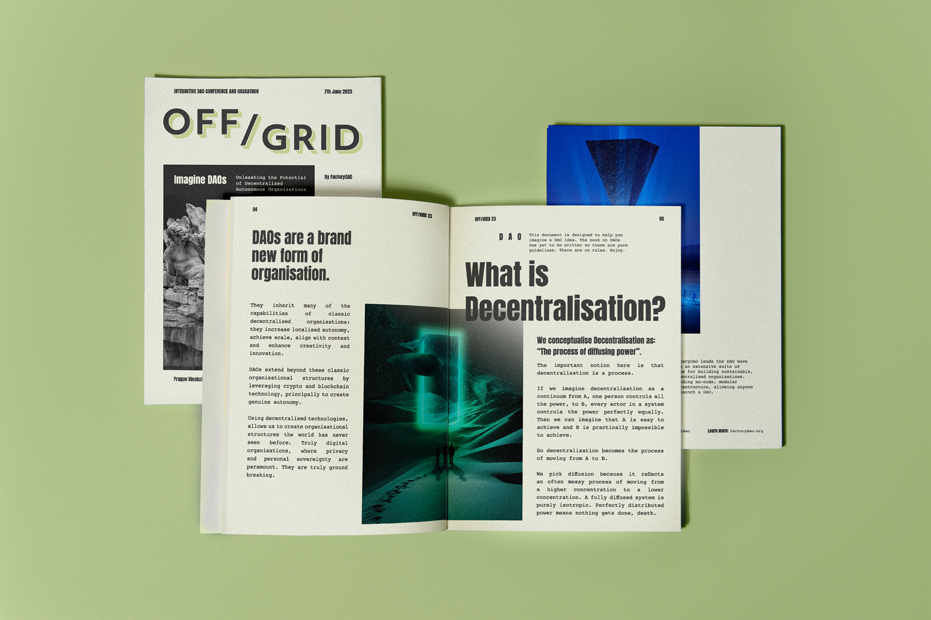OFF/GRID is an experiment in autonomy & collective intelligence. The goal of the event is to learn & share ideas and practices from across the DAO and cryptospace & engage in deep critical discussion & collaboration. Branding, NFT design, merchandise design and production, event design, book design and production, webdesign.
