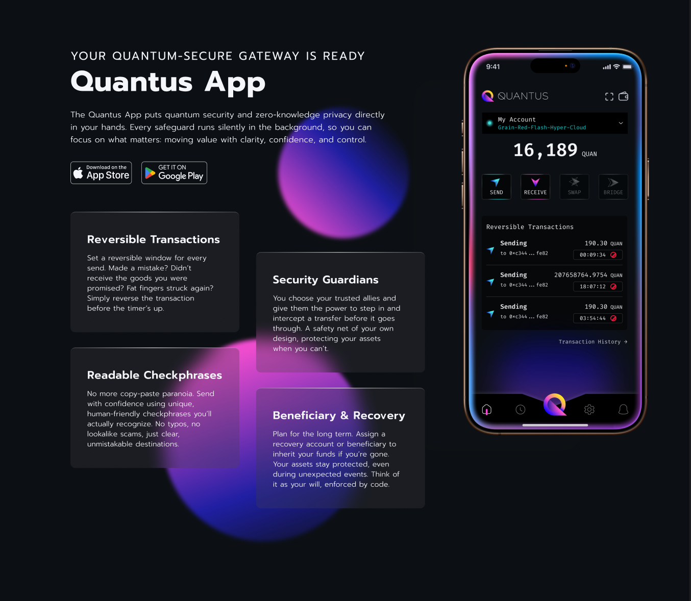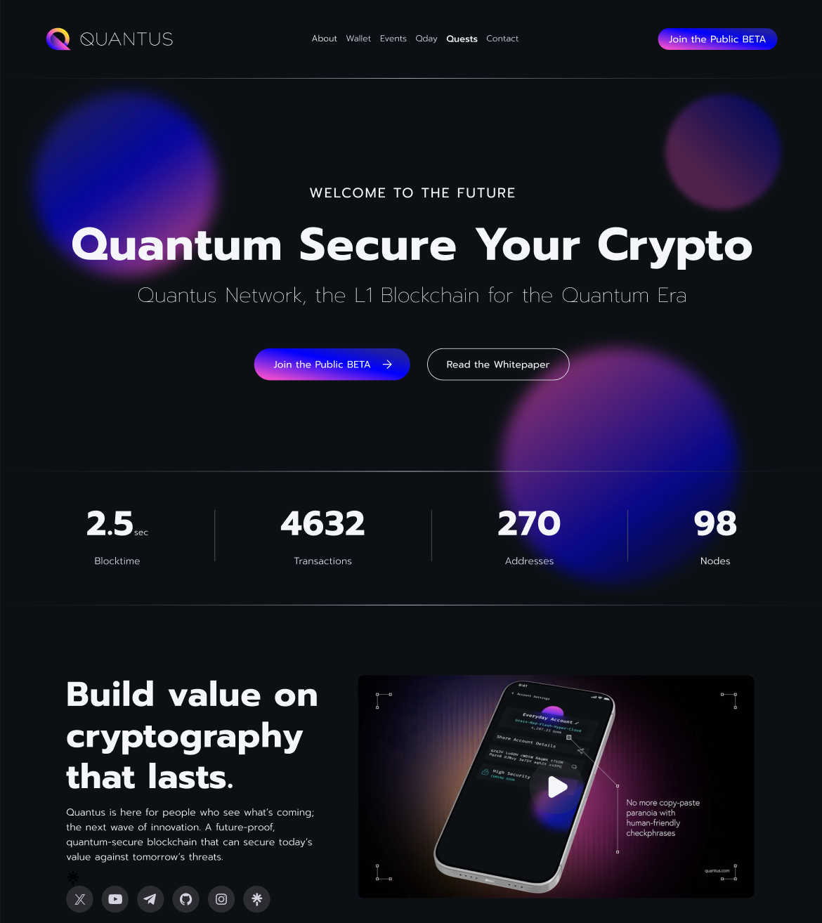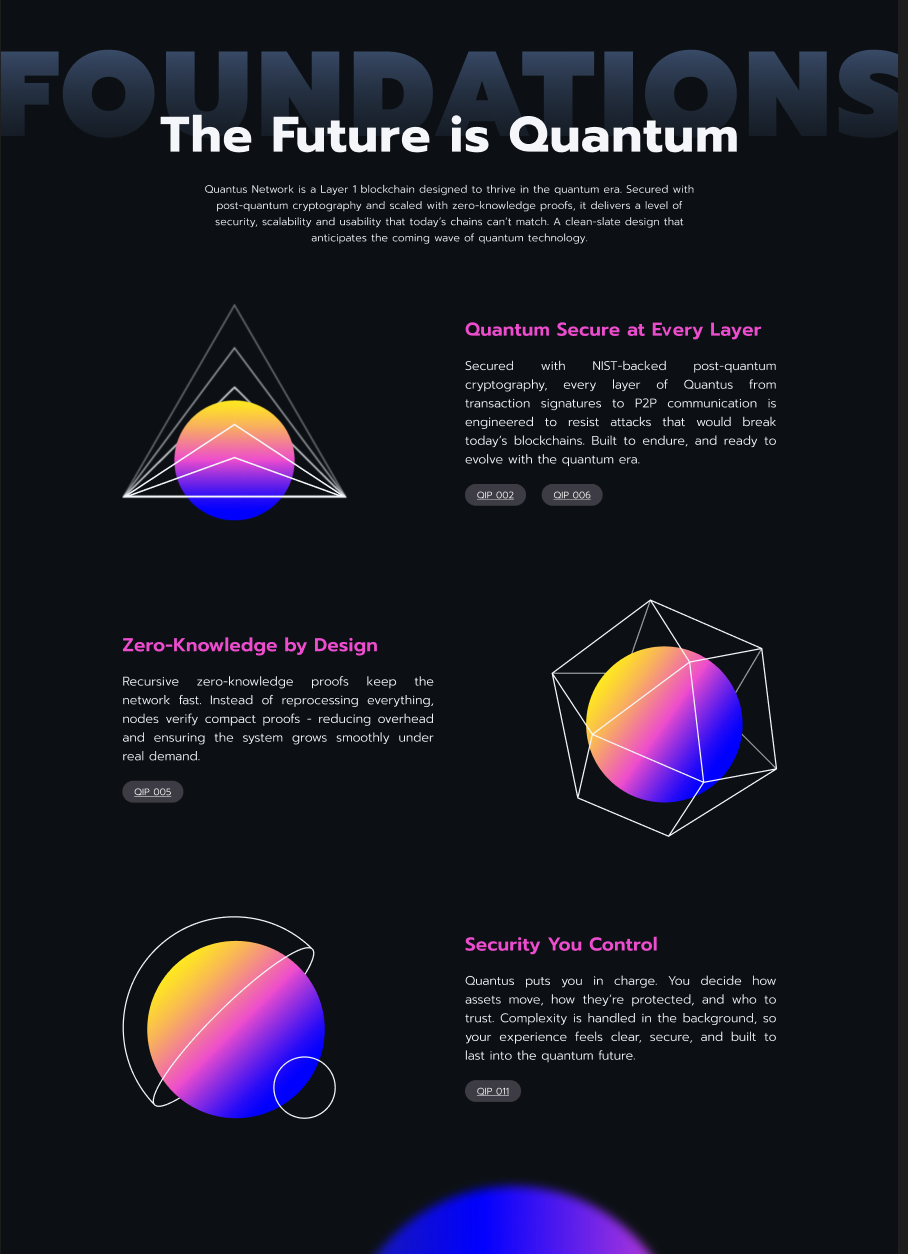 Quantus Network is a Layer 1 blockchain designed to thrive in the quantum era. Built from the ground up with post-quantum cryptography and zero-knowledge proofs, it offers a level of security, privacy and usability that today’s chains can’t match. A clean-slate design that anticipates where the world is heading, not where it’s been.